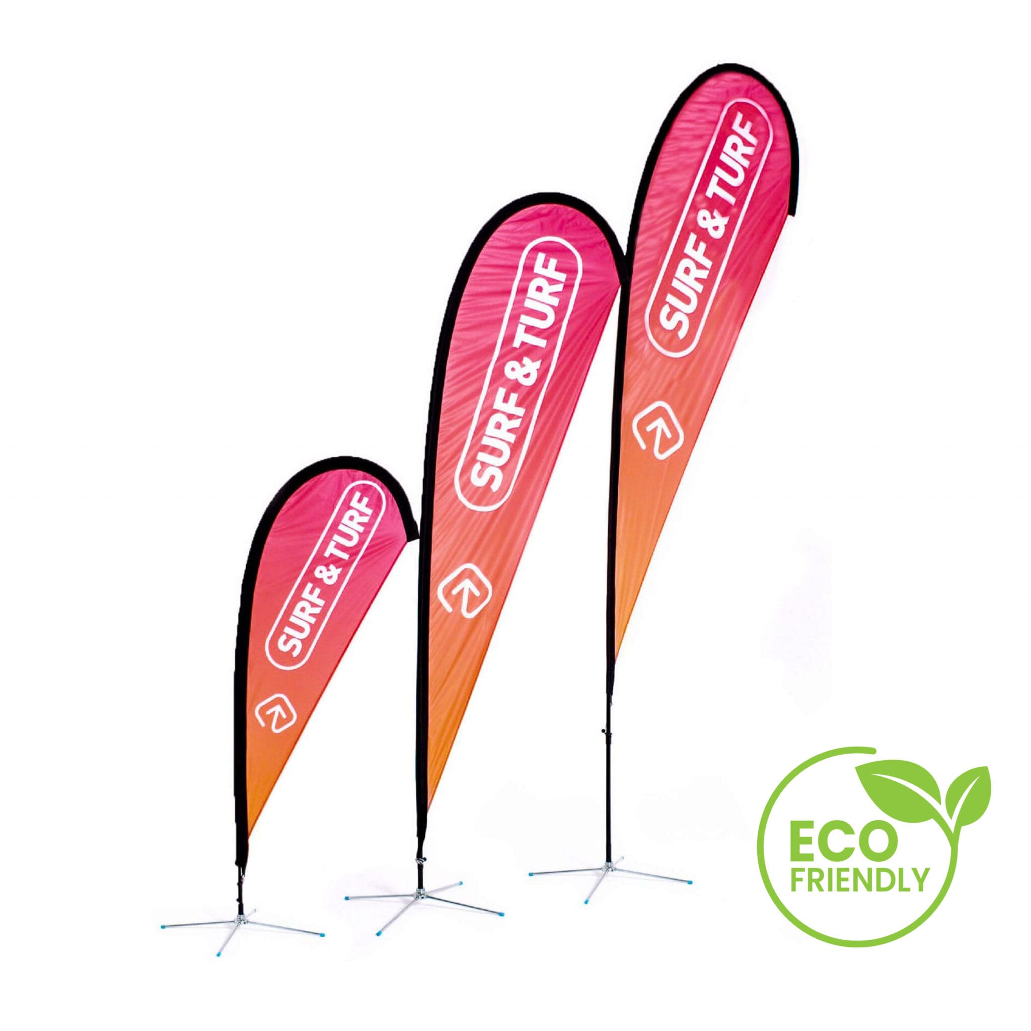 Surf & Turf Eco Teardrop Flags are available in three sizes and with a choice of bases to suit any event environment.